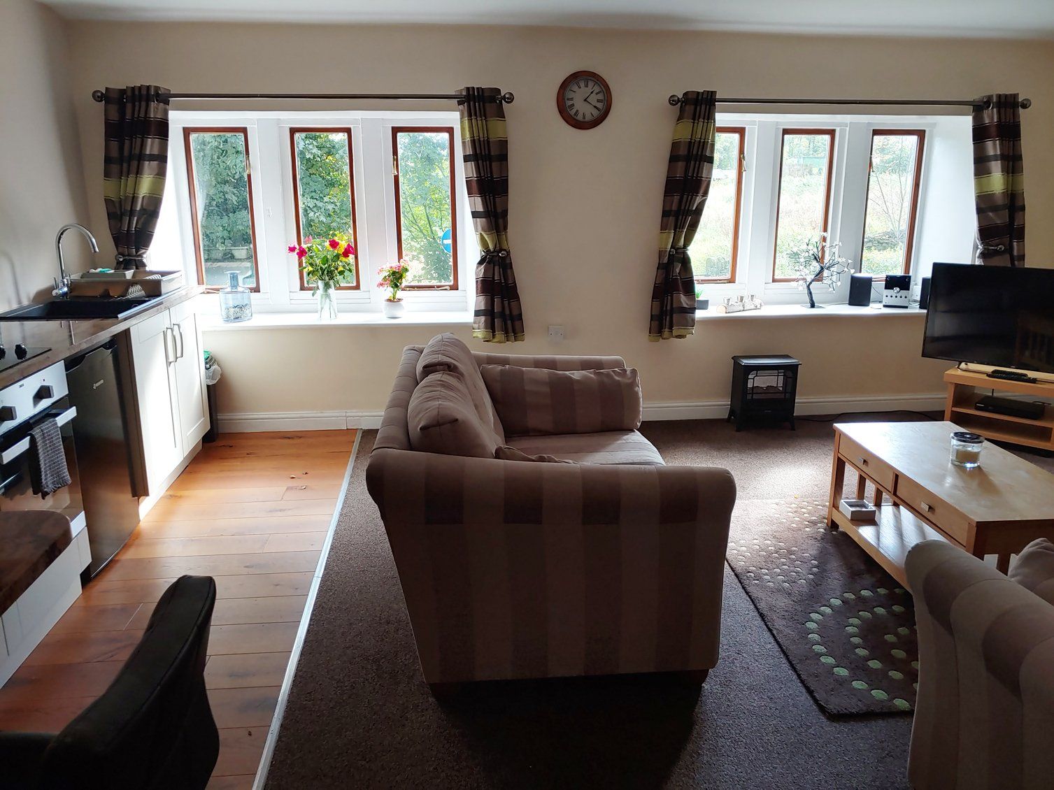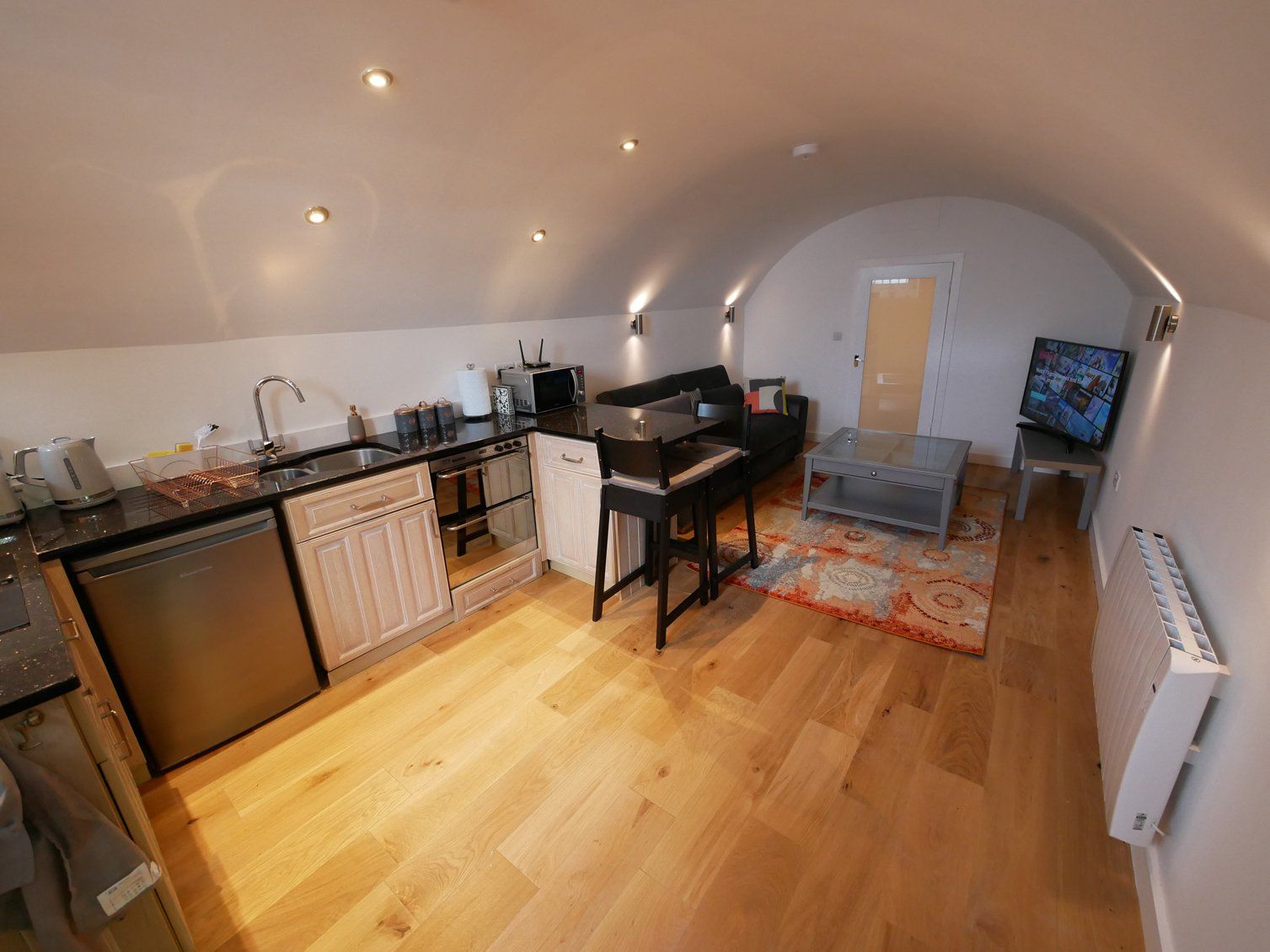 First floor apartment with open plan living room and kitchen, separate double bedroom and shower room. Own entrance and private parking.
